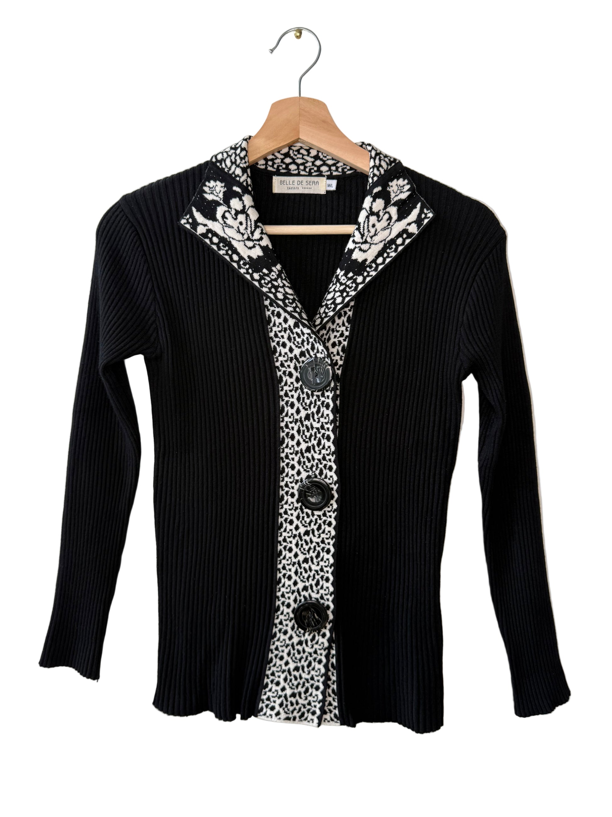 BELLE DE SERA Women's Black Ribbed Knit Sweater with Floral Collar