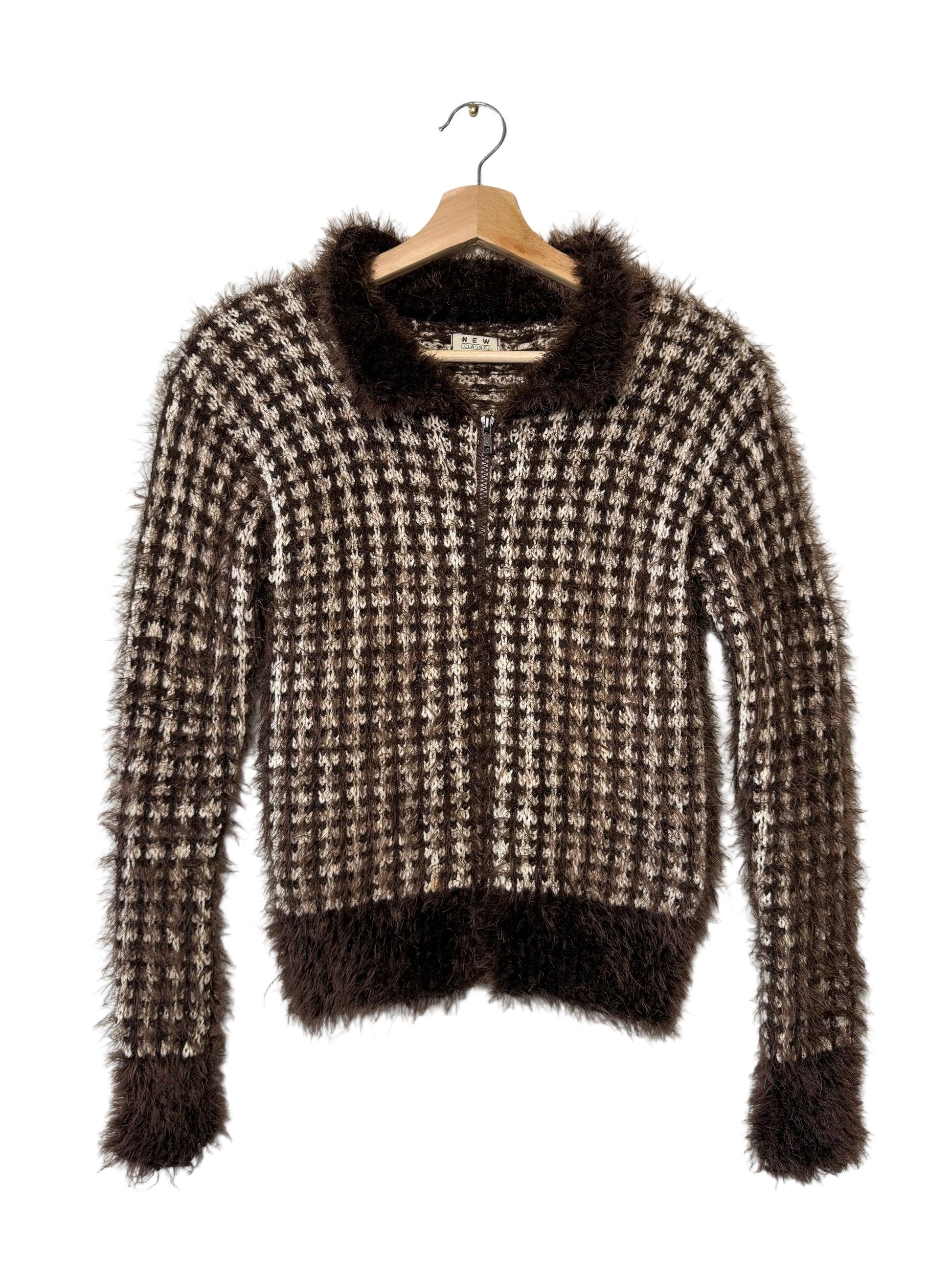 Vintage New Classic London Women's Brown Fuzzy Zip-Up Cardigan