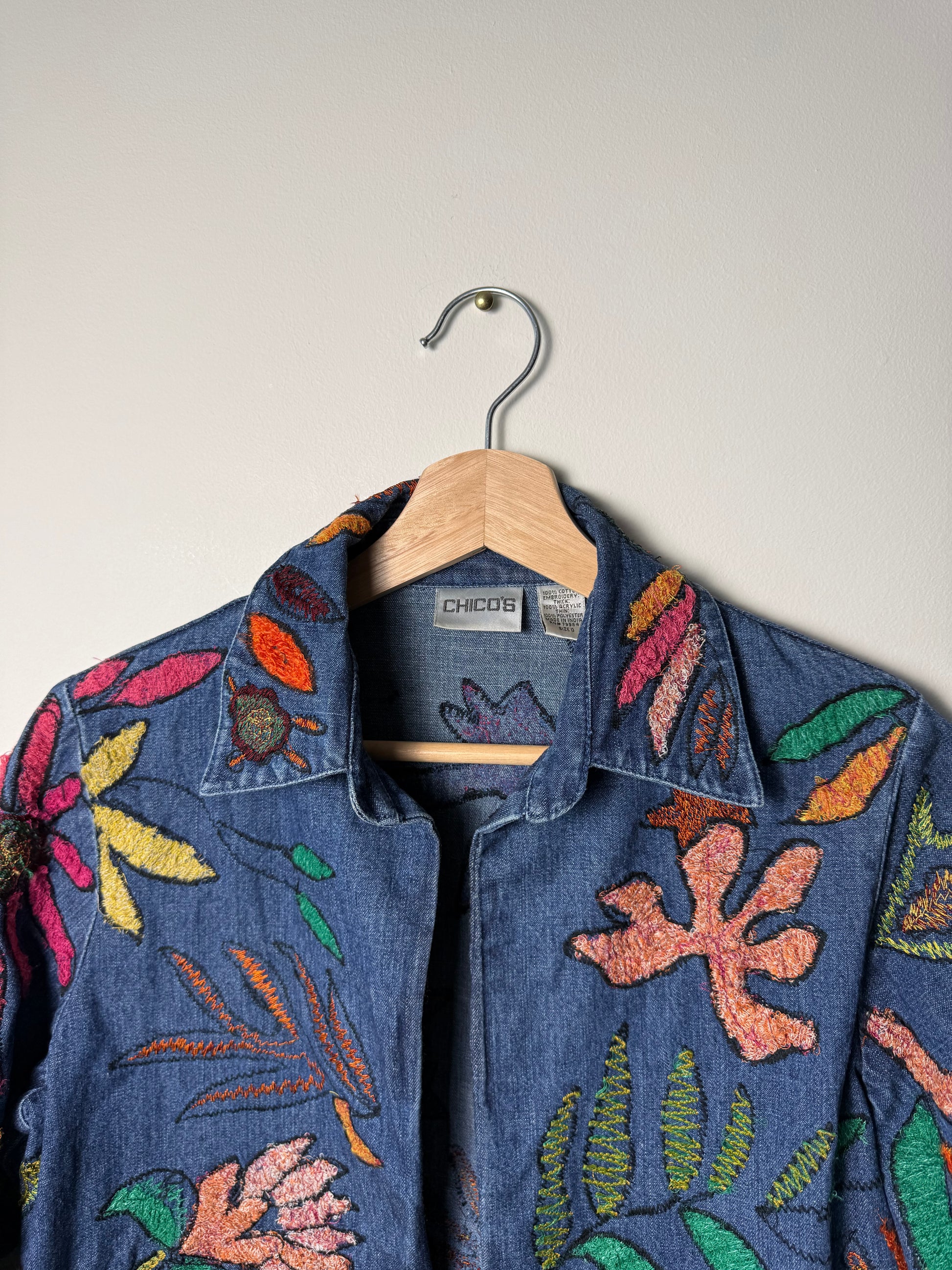 Vintage Y2K Women’s Chico's Open-Front Blue Denim Jacket with Colorful Floral Embroidery